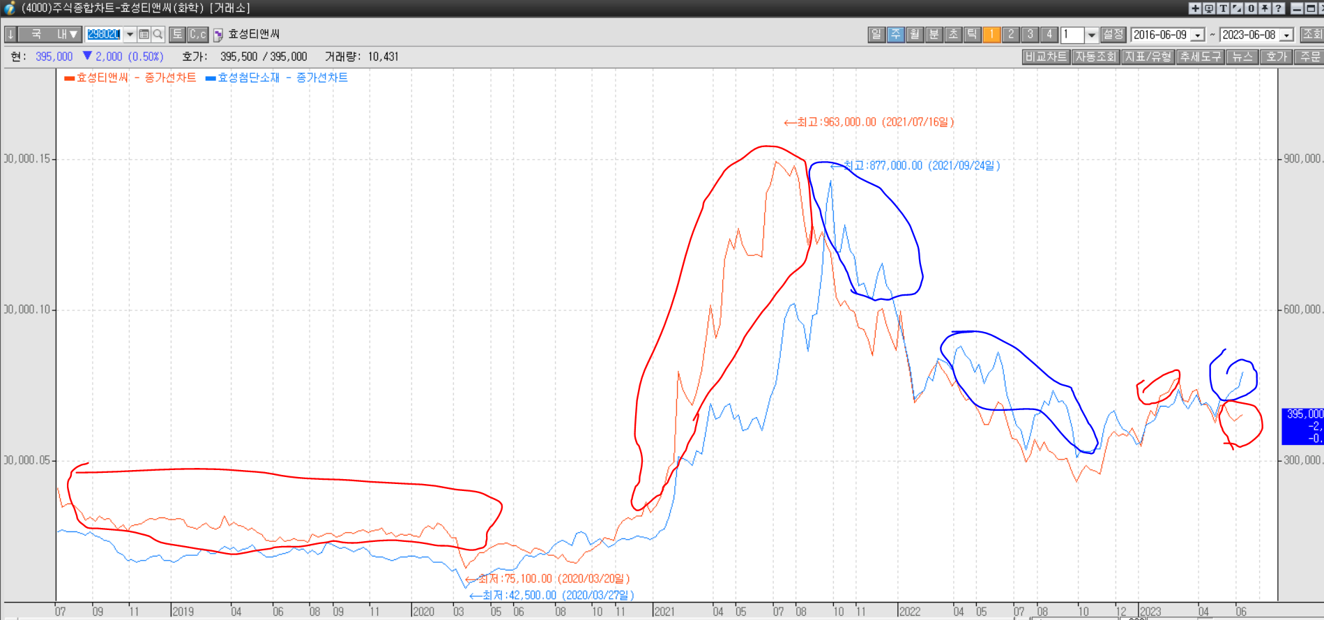 난. 지금 효성첨단소재와 효성티앤씨가. 이런 모습을 보인다고 생각한다.